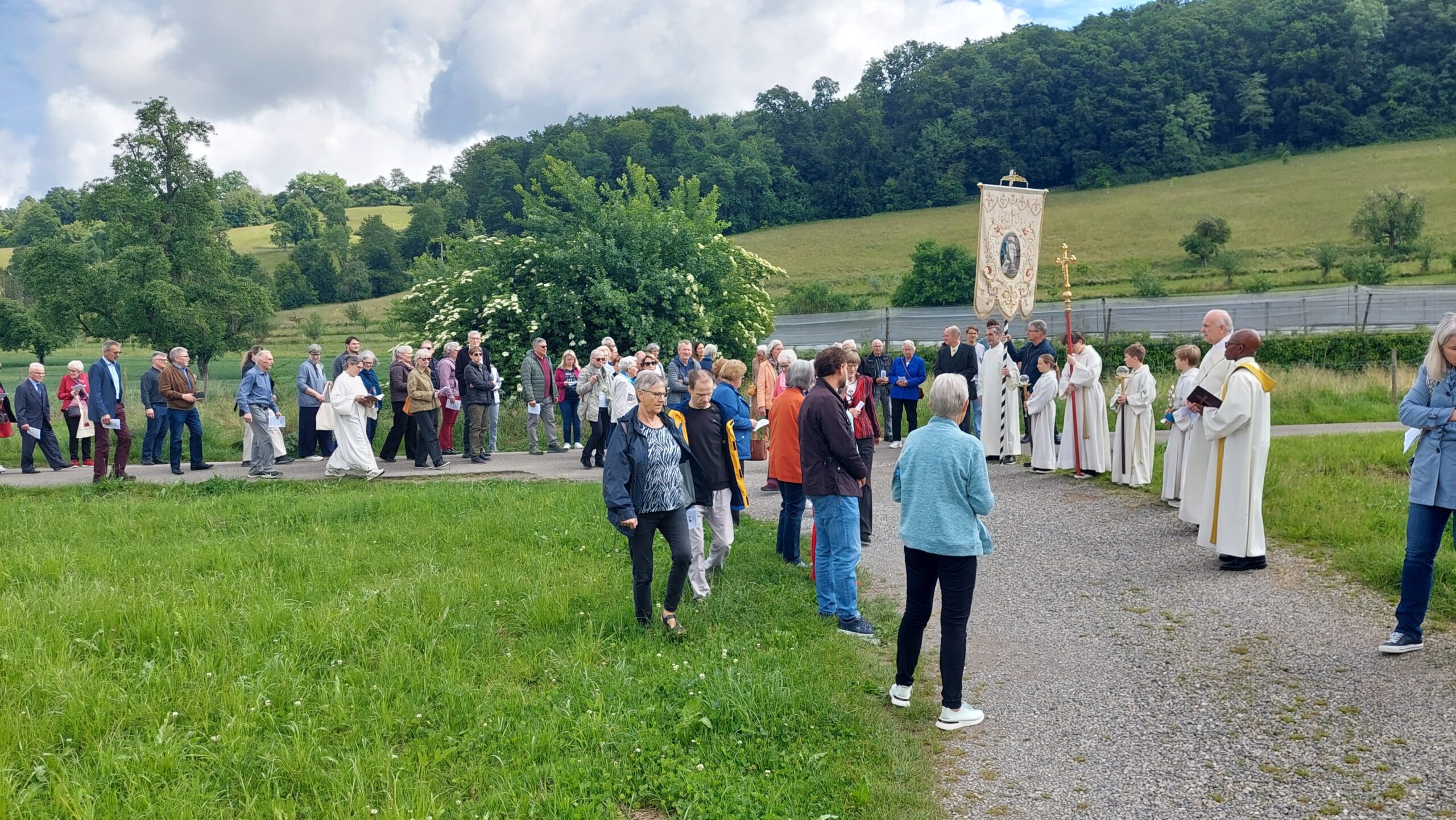 Anschliessend findet die Flurprozession statt, nur bei schönem Wetter. Danach gemütliches Beisammensein bei Wurst und Brot auf dem Kiesplatz hinter der Kirche, bei schlechtem Wetter im Pfarreizentrum.